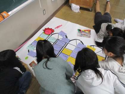 国語科の漢字の広場の学習で「都道府県すごろく」を作りました。4年生の時に学習した漢字を使って、すごろくのマスに入る文章を考えました。考えた文はカードに書き、大きな模造紙に貼っていきました。すごろくが出来上がったら、そのすごろくで遊びました。