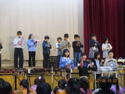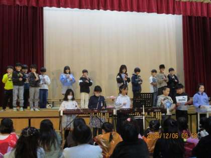 発表会では3年生になってはじめたリコーダーでたくさんの音楽を演奏しました。3年生の教室では、いつも給食時間が終わるとリコーダーをだれかがふきはじめて、つられてふく子がいて、たのしいミニミニ音楽会が開かれます。