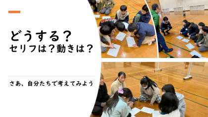 演技練習では、お話に登場する村人のセリフや動きを自分たちで考えて練習しました。