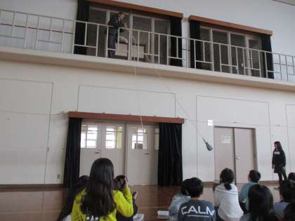 大きなふりこを使って、ふりこの長さと1往復する時間の関係を調べました。体育館の大きなふりこと一緒に子どもたちも揺れながら往復する回数を数えていました。