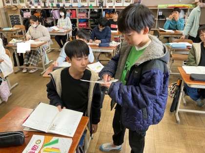 算数の学習の様子です。比例のグラフからわかることを読みとる学習でしたが、人によって着目する視点が違います。「どんな考え?」と聞き、自分の考えと比べています。