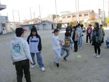 ニコニコグループでチームを作り、全員リレーを行いました。サンタチーム、トナカイチーム、雪だるまチーム、ツリーチーム、プレゼントチームの5チームに分かれて対戦しました。走るのも応援も全校みんな必死になって盛り上がりました。