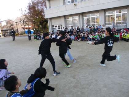 ニコニコ遊びのリレーの様子です。低学年から渡ったバトンが高学年に渡ると,スピード感がどんどん増していきます。全校のみんなで走ったり,応援したりできて楽しかったですね。
