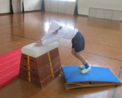 ふみきり、着手、着地の3つをしっかりと意識して、開脚とびや横とびなど色々な跳び越し方にチャレンジしています。