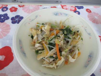 『もやしの煮びたし』は,出汁で油揚げをコトコト煮たところに調味料とにんじん・茹でたもやし・だいこん葉をいれて仕上げます。もやしが美味しかったという声の中に,油揚げが苦手な子どもは,「味がついてる油揚げは苦手〜」と言っている子供もいました。