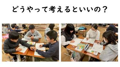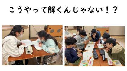 算数科の学習の様子です。図に表して答えを導く問題でした。1人考えるのではなく、友達で考えを出し合い、問題に取り組みました。