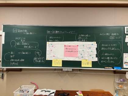 とある行動を「自由」と「自分勝手」に分け、そのちがいについて話し合いました。話していく中で、「自分勝手」とは相手に迷惑をかけることにつながる気が付きました。