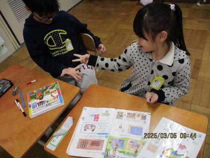 大きさくらべの学習では、陣取りゲームをしました。どちらが広いかを比べるには「マスの数を数えたらいい」と学習しました。白熱したゲームになりました。楽しかったね!