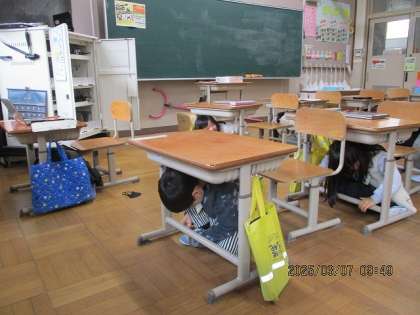 シェイクアウト訓練を行いました。「1姿勢を低く 2頭を守る 3動かない」という3つのポイントを確認し、緊急速報の音の放送を聞いて、さっと行動に移すことができました。そして、被害に遭われたたくさんの方々に黙祷を捧げました。いつ起こるか分からない地震。備えておくことは大切ですね。