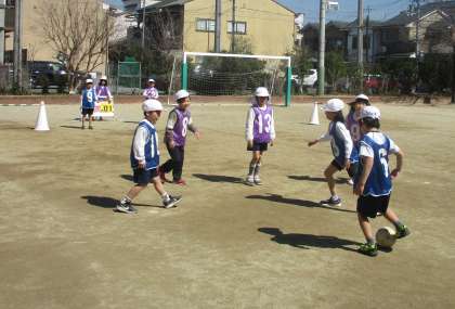試合では、声をかけ合いながらみんなでパスをつなげてシュートする姿や、勝っても負けても友達と仲良く安全に楽しむことができるようになったことが成長です。