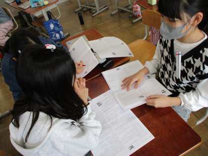 国語科では物語「帰り道」の学習をしています。この学習の最後には、「帰り道」の作者の森絵都さんの作品や同じ年代の子どもが主人公の作品の中から、自分のお気に入りの作品を紹介します。自分のお気に入りの場面を紹介できるように、子どもたちは人物の気持ちの変化に着目して読み進めていました。