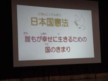 日本国憲法の3原則を分かりやすく,南大内小学校の生活の中でのことに置き換えて話をしてくださいました。