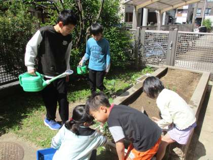 毎朝、みんなで水やりをしています。芽が出たことが嬉しくて、すぐに報告してくれたのでみんなで見に行きました。