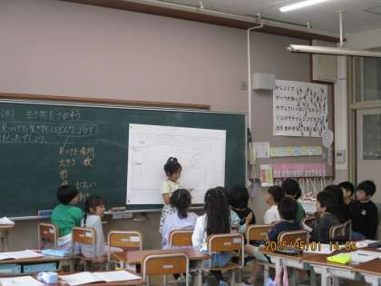 「生き物をさがそう」の単元では見つけた生き物について交流しました。学校のどの辺にいたのか、生き物の様子など、紹介し合いました。「あ〜!いたいた!」「そんなんいるんや!」など色々な声が聞こえてきました。
