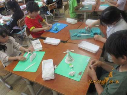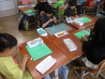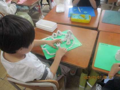 ねん土を使って、自分の住んでみたい町を想像して「マイタウン」を作りました。ねん土をこねて、伸ばして、引っ張って・・・色々な形を作り、自分だけのマイタウンを作りました。次回、それぞれの「マイタウン」を鑑賞したいと思います。