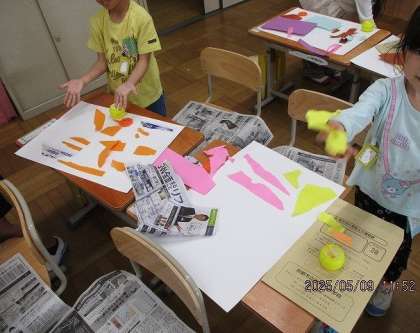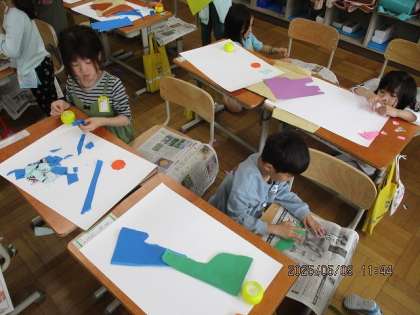 紙を指でやぶいてどんな形に見えるか想像し、作品に仕上げていく学習です。「すべりだいに見える。」「ねこに見える。」と紙をいろいろな向きにして、楽しんで取り組んでいました。