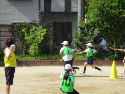 リレーも3回目となりチームワークがどんどん良くなってきました。他チームを応援する姿や協力してタイムを縮めようとする姿が素敵です。