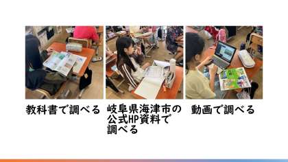 動画を視聴して調べる・教科書で調べる・海津市の公式HPの資料から調べる と自分に合った方法で調べていきました。