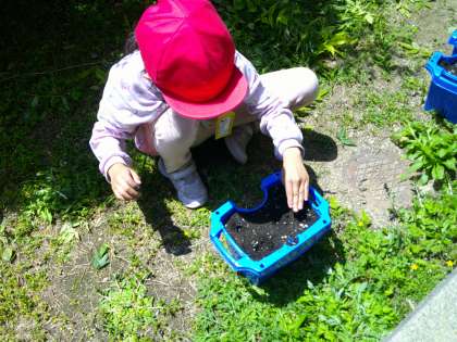 毎日水やりも頑張っています。「大きくなあれ」「芽まだかなぁ」とアサガオの成長が待ち遠しいようです。