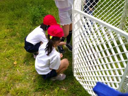 また、アサガオの水やりの行きかえりは、うさぎのモカちゃんに夢中の二人です。