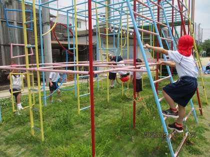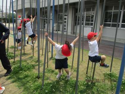 総合遊具、のぼり棒、うんていでいろいろな動きができるようになってきました。少し苦手をもった人も、友だちとなら一緒に挑戦でき、のぼったりぶら下がったりできるようになっていました。「できたー!」「みてー!」とうれしそうな表情を見せてくれました。