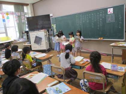 音読をみんなの前で発表しています。おうちでも一生懸命取り組んでいる人もたくさんいて、とても上手に読んでいました!毎日の取り組み、ありがとうございます。