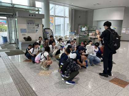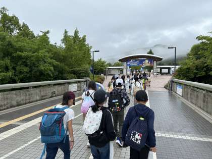 あすたむらんど徳島に到着しました。あいかわらずの雨で、お弁当はバスの中でいただきましたが、その後雨があがり集合写真が撮れました。いろいろな科学の不思議に触れ合っています。