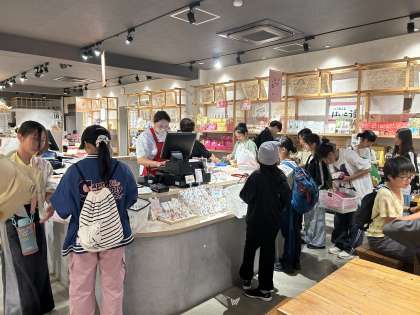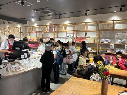 雨のこんびらさんから降りてくると、お土産タイムです。お父さんには、お母さんには…と予算をやりくりしながらいろいろなお土産を選んでいます。香川県だからやっぱりうどんかなとか、オリーブオイルもいいかなと手に取っては返していました。