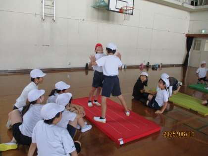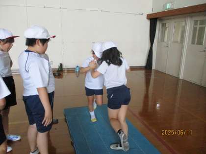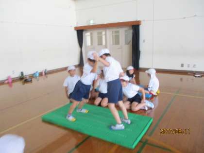 今週の体育は外で鉄棒運動をする予定でしたが、雨で外に出られなかったため、相撲遊びを行いました。「怪我無く、楽しく」を目標にいろいろな相撲遊びをして過ごしました。手押し相撲やお尻相撲など多くの種類があることを知り、どうしたらうまくいくかという工夫も考えて、良い学習の時間となりました。