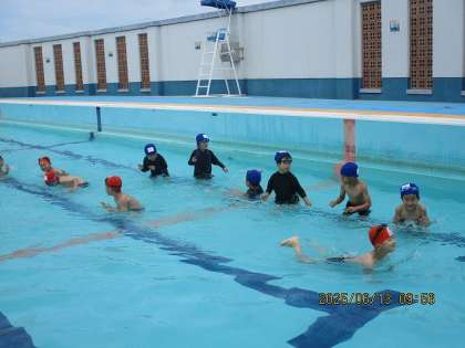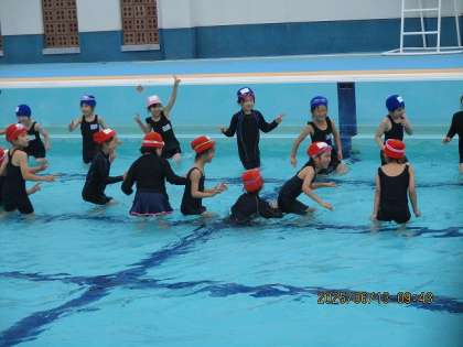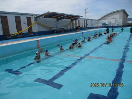待ちに待った「みずあそび」の時間です。幼稚園・保育園より広いプールで、1年生は大はしゃぎでした!2年生がリードしてくれ、水の掛け合いをしたりカニになって歩いたりしています。
