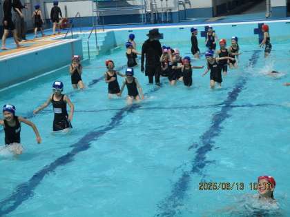 今日は、アヒルやカニ、わになど、動物になって歩いたり顔つけをしたりしました。来週からはもう少し水位が上がります。