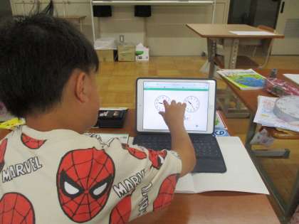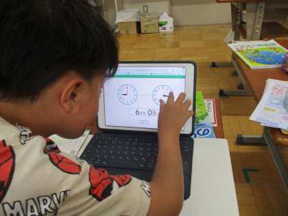 時計の学習をしました。タブレット端末を使って、時計の針を動かしながら学習をしました。見るだけではなく、実際に針を動かすことで、変化が分かり、スムーズに取り組むことができました。
