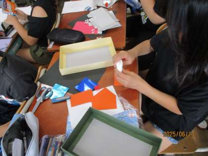先日から取り組み始めた「ゆめの乗り物」の作品作りですが、お家の方のご協力で集まった箱を使いながらついに工作を始めました。それぞれのアイディアを見るのが楽しくて私にとってもいい時間です。ボンドや箱などをゆずりあっている姿が素敵です。完成が待ち遠しいです!