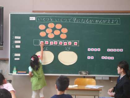 1年生の算数,数図ブロックを使って「9の合成分解」の学習をしました。計算の基礎「□と□で9」「9は□と□」などが言えるようにしていきたいです。