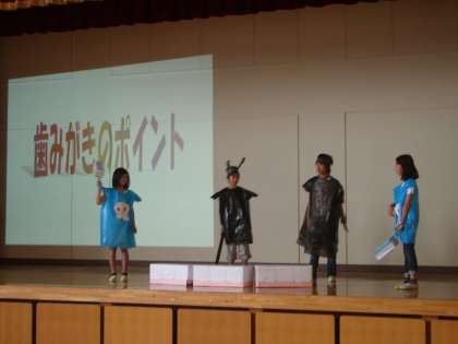 6月4日は,むし歯予防デ—。朝会の後,委員会の子ども達がむし歯予防と歯の磨き方について,劇で呼びかけました。今週は歯の衛生週間,給食の後の歯磨きも気をつけてさせたいと思います。