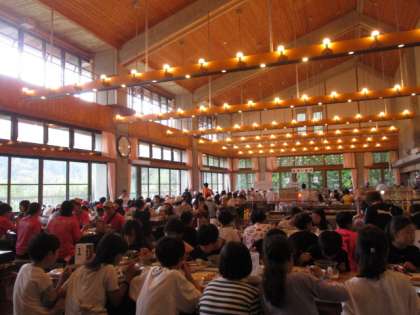 右の写真は食堂全体の様子です。同時期に泊まっている樫原小学校の5年生は150名で5クラスだそうです。この2校で食堂は満席です。