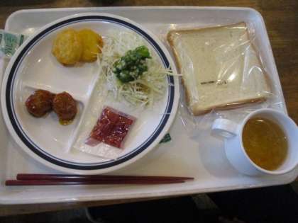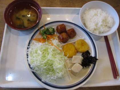 本日はミートボール,ナゲット,焼き鮭などの献立です。