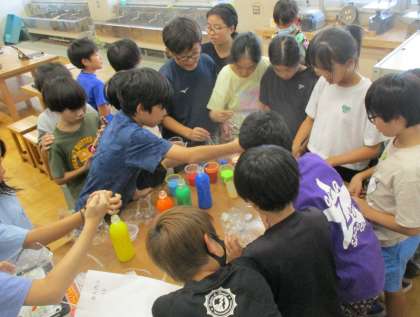 「水から発見 ここきれい!」という単元で色水を使って、水がもつ美しさや形、色の変化を発見しました。