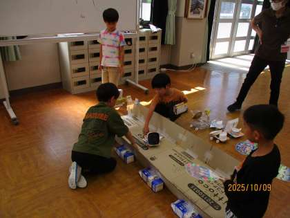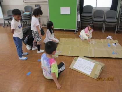 ペットボトルや、はこ、プラカップなどを使って、ゴムの力や風の力を使って、走る車を作りました。競争したり、記録をはかったりして遊びました。