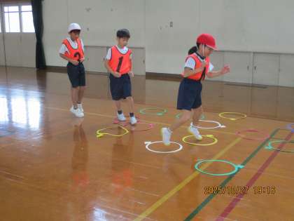 とびあそびで使った「ケンステップ」も足や手をわっかの中にいれてあそんだり、体育館で運動すると、またちがった動きができました。