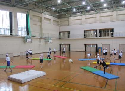 5年生では、マットの配置を円形にしています。こうすることで回りの友達の動きがよく見え、練習するときの参考になります。