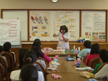 11月1日,5・6年生のための歯科衛生士さんによる歯磨き巡回指導が行われました。歯ブラシは、ペンを持つように持つ。磨く力が強くなりやすく、歯ブラシの動きが大きくなりやすいので、わしづかみは避ける。毛先を使うこと,歯の面に直角に当てること,力を入れないでこすること,小刻みに動かすことなど,順番にていねいに教えていただきました。