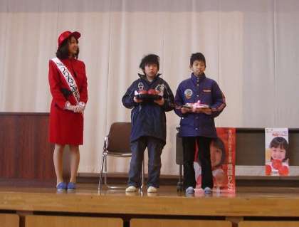 2月25日,今年も青森からミスりんごが来校。りんごについてのお話を聞きました。「青森は日本で一番りんごの生産量が多い。皮にポリフェノールが含まれているので皮ごと食べるとよい。」などりんごについてお話を聞きました。「りんごはどうして『りんご』というのですか。」「りんごはなぜ赤くなるのですか。」などの質問にも答えて下さいました。おいしいりんごをいただきました。