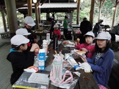 5月16日(木)「山の家」4日目。朝食は「パックドッグ」です。パンにソーセージやキャベツをはさみ,ホイルにくるんで牛乳パックの中へいれます。かまどで,牛乳パックに火をつけて,パックが燃え尽きる頃にはおいしい「パックドッグ」のできあがりです。