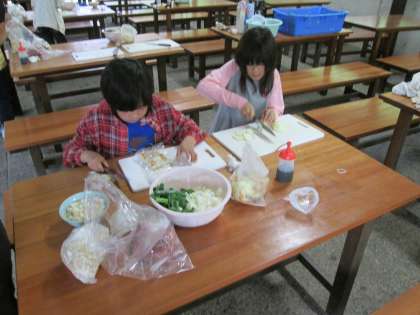 1日(土)の午後は野外炊事です。メニューは「すきやき風」。材料を切る係と薪に火をつける係に分かれて,炊事を進めていきます。出来上がりに近づくにつれて,おいしそうなにおいが漂ってきます。自分たちでつくった「すきやき風煮」を,みんなでおいしくいただきました。