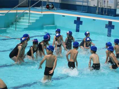 初めてのこの日は,南大内小学校のプールの使い方やルールを確認した後,水遊びを楽しみました。水をかけたり,ワニ歩きをしたり。最後は碁石拾いをしました。