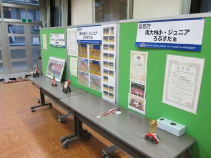 大会に向けての練習風景も含めて,近畿大会や全国大会の試合の様子を映像で見ていただいたり,試合結果の報告をさせていただいたりしました。子どもたちからも,大会の感想やお礼の言葉を伝えさせていただきました。地域の方から,「準優勝おめでとう。」「よくがんばったね。」と声をかけていただき,子どもたちはとても嬉しそうでした。8月25日(日)の京都府大会は,南大内校が会場だったので,優勝の瞬間を直接見ていただくことができました。