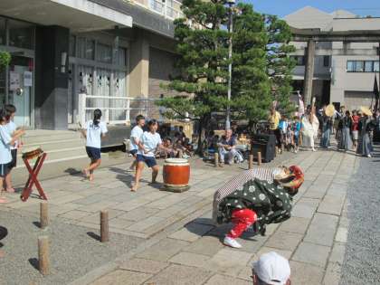 この日に向けて練習してきた子どもたちがたたく,力強い和太鼓のひびきが,お祭りのおみこしの出発を盛り上げていました。