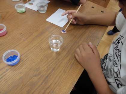 銅版の上に,「ホセ」という木の小さなヘラのようなものを使って,七宝焼の絵の具を置いていきます。あらかじめ紙に描いておいた自分のデザインを見ながら,厚さが同じになるように,絵の具を置いていきました。電気がまの上で,余分な水分を乾燥した後,約800度になっているかまの中に,銅版を入れてもらいました。3分くらいすると,絵の具がとけて,出来上がりです。