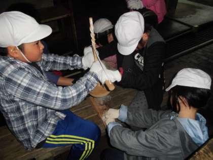 グループで協力し,代わる代わる擦っても,煙は出てくるのですが,なかなか火種は生まれません。初体験で腕も疲れ,何度も何度もチャレンジしてもうまくいきません。やっとのことで火種が生まれ,大事に大事に「もぐさ」に移し,ポッと火がついたときには大喜びでした。4班すべてが成功しました。その火は,ローソクに移し,野外炊飯のかまどの火としました。
